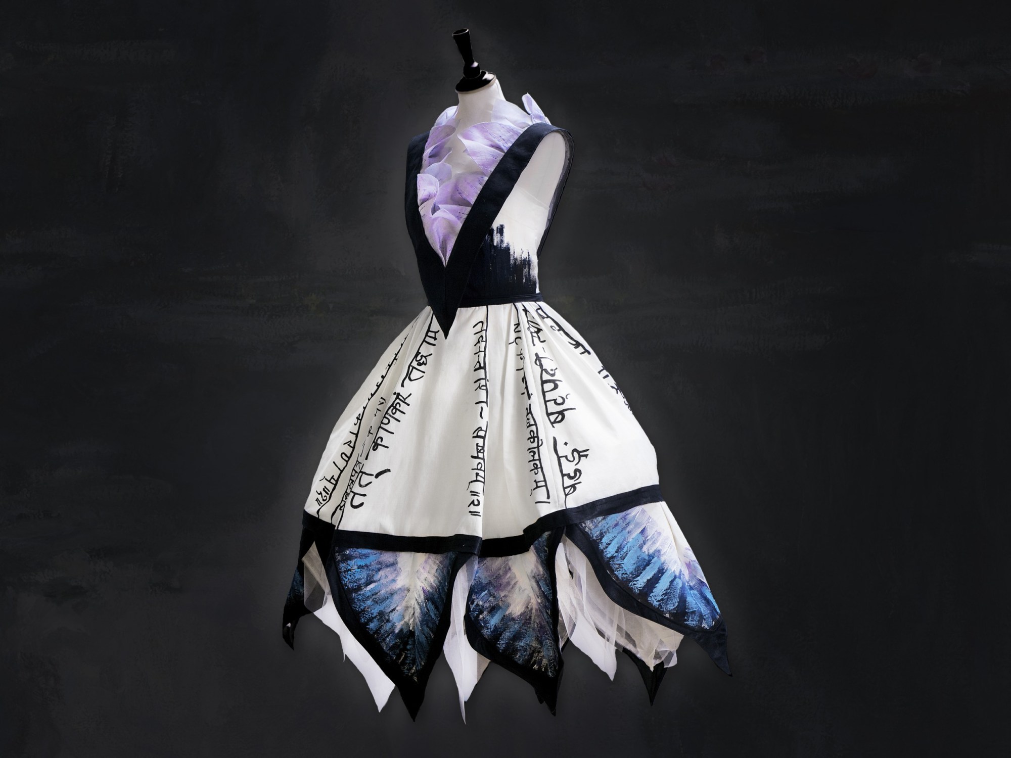 The Mandala of Desires (Blue Lotus Wish Tree) dress needs little introduction, having been exhibited at the China Art Museum in Shanghai, in 2015, as well as having received considerable media coverage. The Mandala of Desires is the second in Mandali Mendrilla’s Wish Tree Dress series.