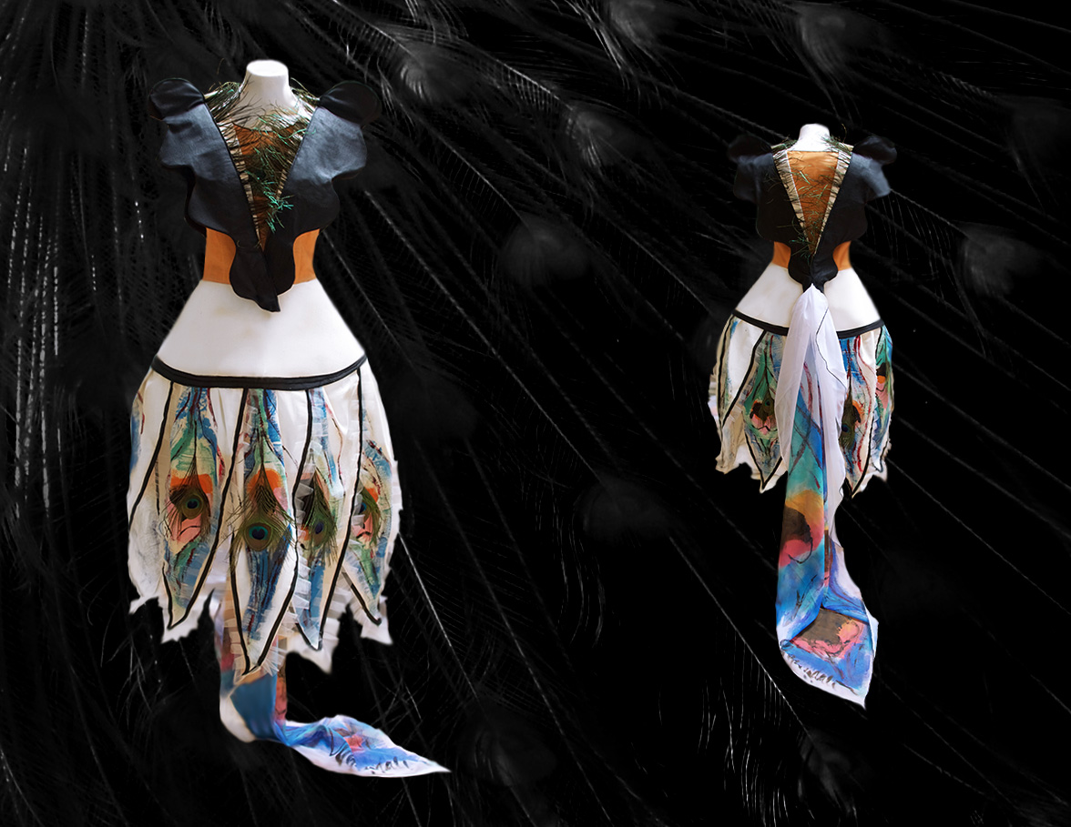 Mandali Mendrilla’s sketch for the sculpture dress named ‘Kamadhenu'(Wish Tree Dress III), executed in peace silk, peacock feathers and ecological textile ink.